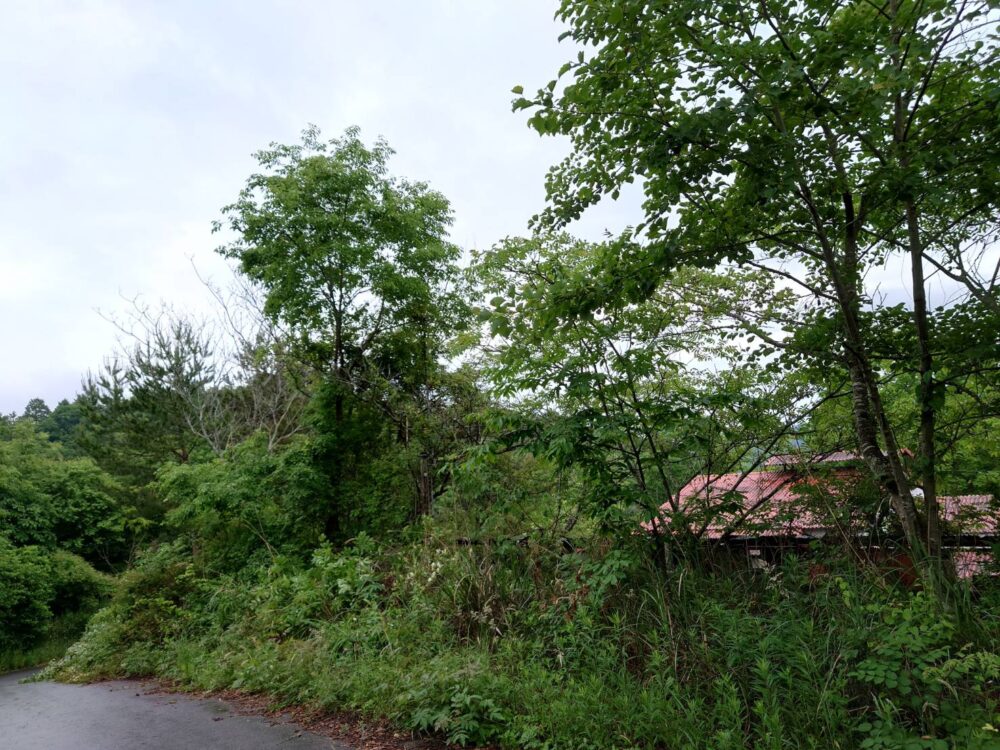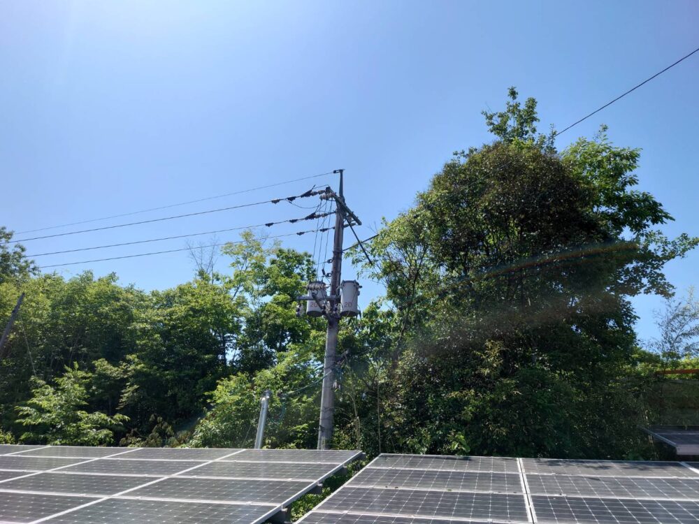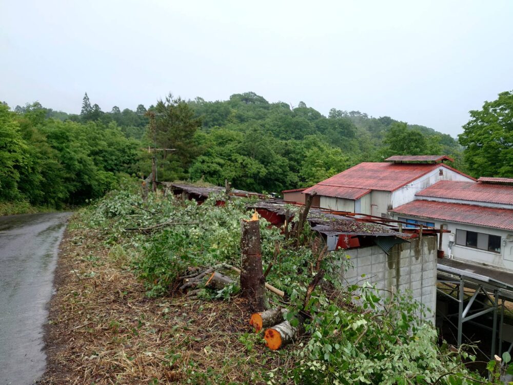 太陽光パネルの周りに何本も木があり影を落としたり倒木でパネルを損傷することが考えられるので今回はバッサリと伐採します